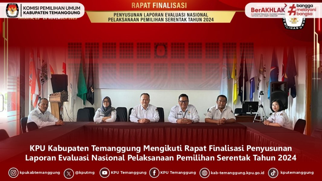 TEMANGGUNG - KPU Kabupaten Temanggung mengikuti Rapat Finalisasi Penyusunan Laporan Evaluasi Naisonal Pelaksanaan Pemilihan Serentak Tahun 2024 yang diselenggarakan KPU RI secara daring pada Minggu s.d Selasa (23-25/11/2025) Dalam kegiatan tersebut, KPU Kabupaten Temanggung masuk pada classroom 2 yang mengangkat pokok bahasan mengenai pengelolaan logistik dan teknologi, sosialisasi dan partisipasi masyarakat serta hukum. Selaku penyaji materi adalah Tim Pakar Dr. Endang Sulastri dan Nurlia Dian Paramita Kegiatan diakhiri dengan penyampaian kesimpulan dan outline Buku Laporan Evaluasi Nasional Pelaksanaan Pemilihan Serentak Tahun 2024 secara Makro oleh Tim Pakar Dr. Ahsanul Minan #kpu #temanggung #kputemanggung #kpumelayani #evaluasi #finalisasi ....