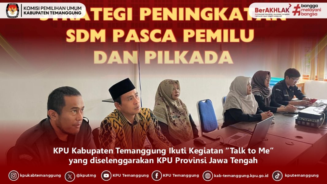 TEMANGGUNG - dalam rangka evaluasi dan refleksi terhadap kondisi serta kebutuhan pengembangan SDM pasca berakhirnya Pemilu dan Pilkada, KPU Kabupaten Temanggung ikuti kegiatan “Talk to Me” yang diselenggarakan KPU Provinsi Jawa Tengah secara daring pada Rabu (26/11/2025) Talk to Me dengan tema “Strategi Peningkatan SDM Pasca Pemilu dan Pilkada” menghadirkan Ketua Divisi SDM, Organisasi, dan PKSDM KPU RI, Parsadaan Harahap dan Tenaga Ahli Divisi SDM, Organisasi, dan PKSDM KPU RI, Firnandes Maurisya Dipaparkan upaya-upaya yang dapat dilakukan oleh penyelenggara Pemilu dalam rangka optimalisasi SDM, yakni pemahaman nilai dasar KPU yang meliputi loyalitas, profesionalitas, integritas, dan loyalitas, sinergitas komisioner dan sekretariat, komunikasi internal/arahan pimpinan, distribusi peran, dan evaluasi berkala Kegiatan ini diharapkan dapat mendorong terwujudnya kolaborasi antar lembaga dalam merumuskan kebijakan pengembangan SDM yang lebih efektif dan berkelanjutan #kpu #temanggung #kputemanggung #kpumelayani #pascapemilu #pascapilkada #sdm #talktome ....