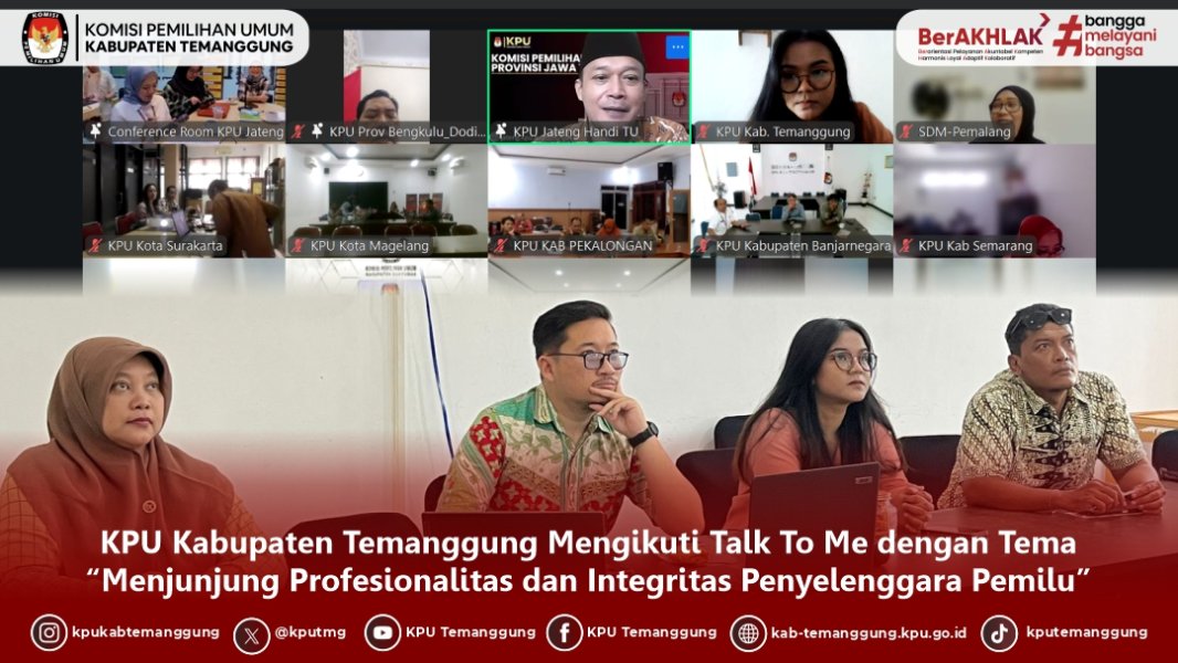TEMANGGUNG - Dalam rangka penguatan budaya kerja ASN Ber-AKHLAK di Lingkungan Sekretariat Jendral KPU, Sekretariat KPU Provinsi dan Sekretariat KPU Kabupaten/Kota, KPU Kabupaten Temanggung mengikuti Knowledge Sharing Implementasi Budaya Kerja BerAKHLAK yang diselenggarakan oleh KPU RI secara daring pada Kamis, (25/09/2025) Yuli Hertaty, Kepala Biro SDM membuka sekaligus memberikan arahan dalam kegiatan ini. Hadir sebagai narasumber Asisten Deputi Bidang Sumber Daya Manusia Aparatur Kementerian PANRB, Karmaji yang menyampaikan materi seputar Penguatan Implementasi Budaya Kerja BerAKHLAK di antaranya terkait Asta Cita, Urgensi Nilai-nilai Dasar (Core Value), Implementasi Nilai-nilai Dasar ASN, Hasil Survei Budaya Kerja ASN 2024, dan Strategi Penguatan Budaya Kerja ASN Kegiatan diikuti Plt. Sekretaris, Plt. Kasubag Parmas dan SDM, serta Staf Subbag Parmas dan SDM KPU Kabupaten Temanggung #kpu #temanggung #kputemanggung #kpumelayani #sdm #berakhlak #asn
