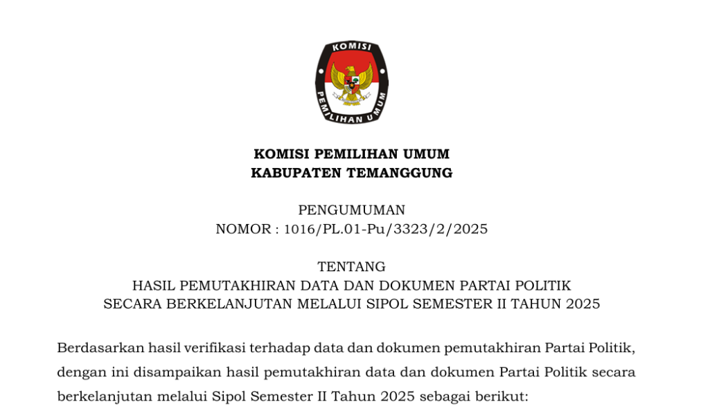Dalam rangka melaksanakan Keputusan KPU Kabupaten Temanggung Nomor 994 Tahun 2024 tentang Pedoman Teknis Pelaksanaan Tahapan dan Jadwal Penyelenggaraan Pemilihan Bupati dan Wakil Bupati Temanggung Tahun 2024 serta Keputusan KPU Kabupaten Temanggung Nomor 1001 Tahun 2024 tentang Pedoman Teknis Pendaftaran Lembaga Survei atau Jajak Pendapat dan Penghitungan Cepat Hasil Pemilihan Bupati dan Wakil Bupati Temanggung Tahun 2024, KPU Kabupaten Temanggung mengumumkan pendaftaran Lembaga Survei atau Jajak Pendapat dan Penghitungan Cepat Hasil Pemilihan Bupati dan Wakil Bupati Temanggung Tahun 2024 dengan ketentuan sebagai berikut: