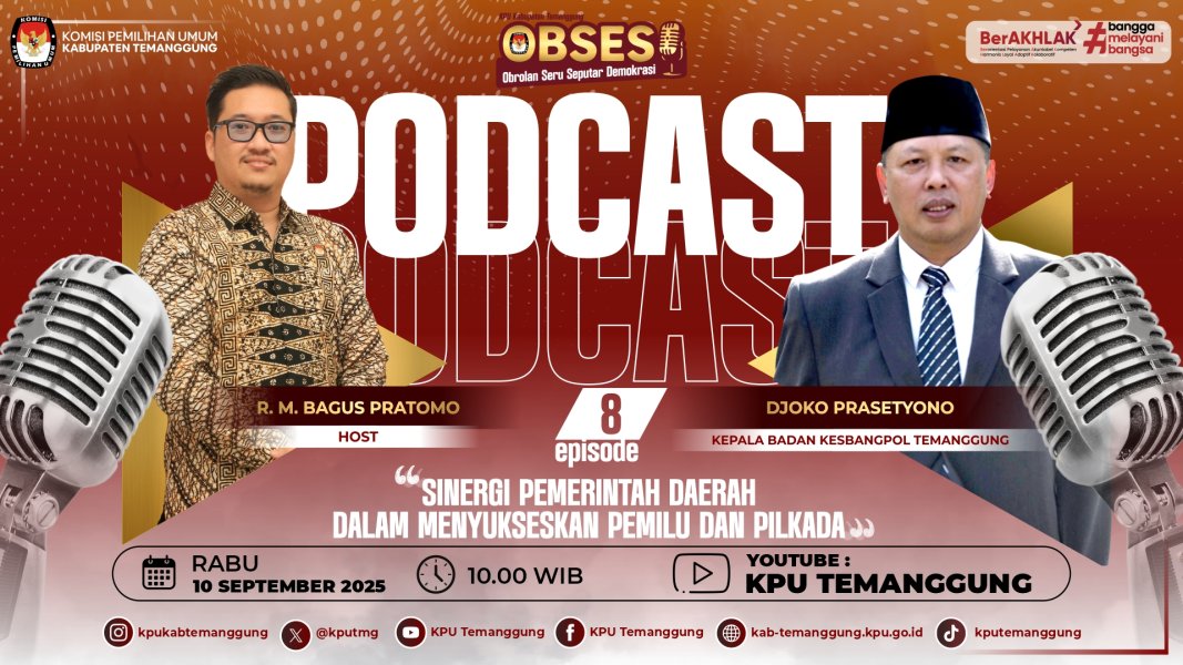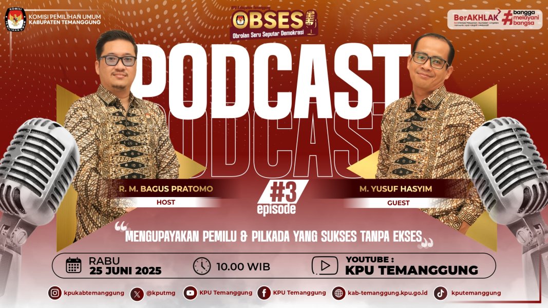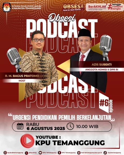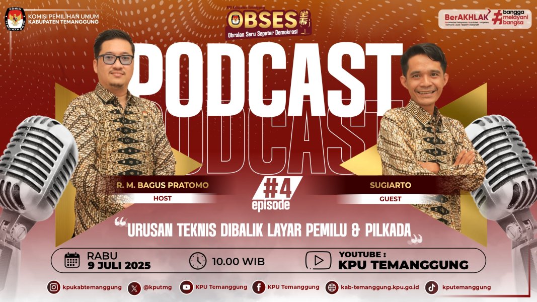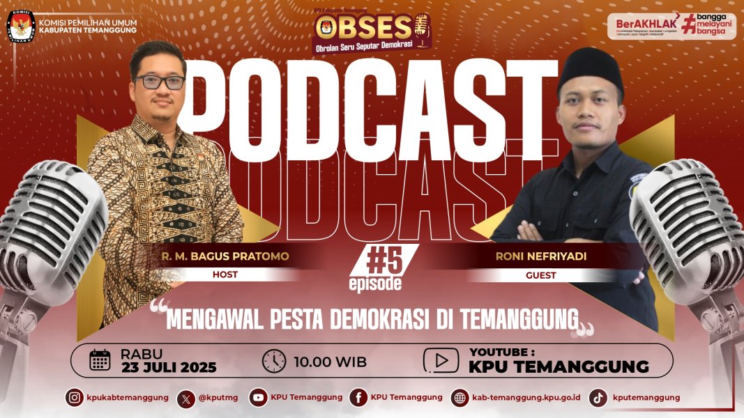 Episode #5 : Mengawal Pesta Demokrasi di Temanggung Minggu, 20 Juli 2025 14:22 1763 Podcast Obsesi (Obrolan Seru Seputar Demokrasi) KPU Kabupaten Temanggung episode #2 tayang pada Rabu, 9 Juli 2025 YOUTUBE : KPU Temanggung Baca Selengkapnya