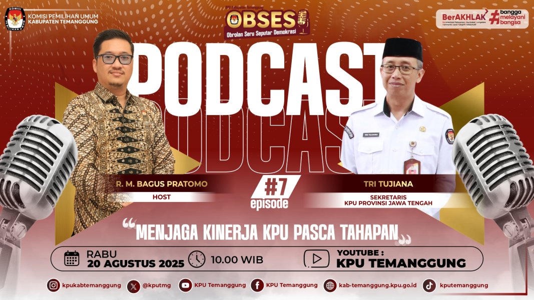 Episode #7 : Menjaga Kinerja KPU Pasca Tahapan Minggu, 17 Agustus 2025 13:28 1593 Podcast Obsesi (Obrolan Seru Seputar Demokrasi) KPU Kabupaten Temanggung episode #6 tayang pada Rabu, 20 Agustus 2025 YOUTUBE : KPU Temanggung Baca Selengkapnya