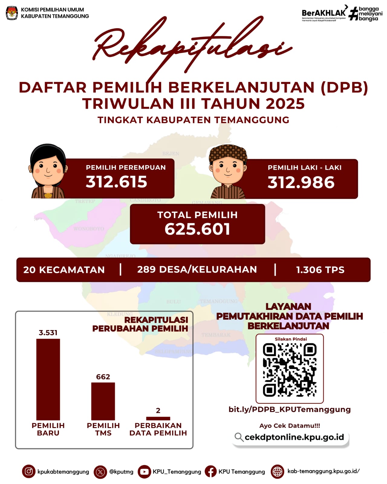 Berpedoman pada Peraturan KPU Nomor 1 Tahun 2025 tentang Pemutakhiran Data Pemilih Berkelanjutan, KPU Kabupaten Temanggung secara periodik melakukan pemutakhiran data pemilih berkelanjutan dan melakukan rekapitulasi per tiga bulan yang dituangkan dalam Berita Acara.