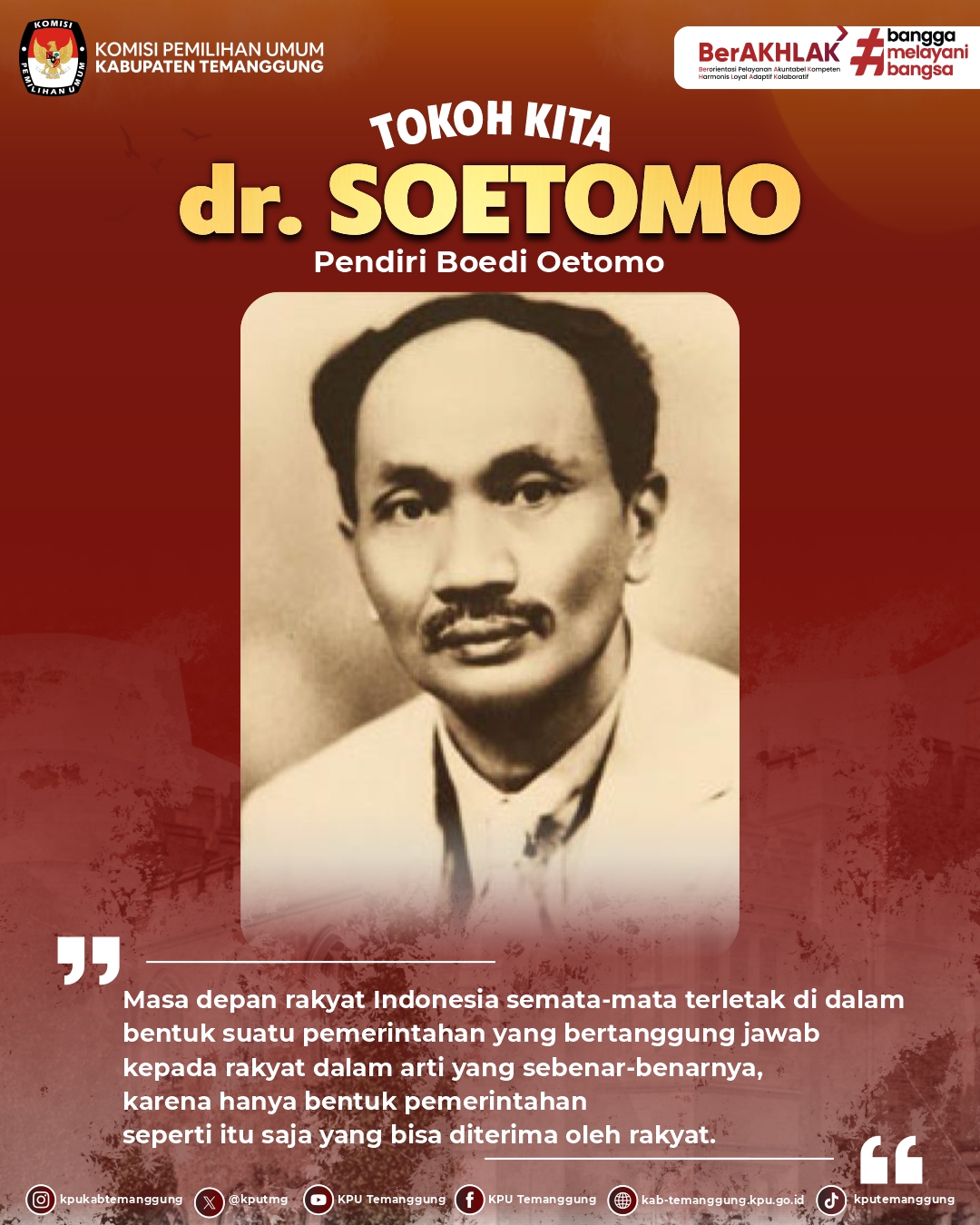 Hai #TemanPemilih, hari ini KPU Kab. Temanggung mengajak teman semua untuk mengenal lebih jauh sosok salah satu tokoh Bangsa Indonesia, yaitu dr. Soetomo