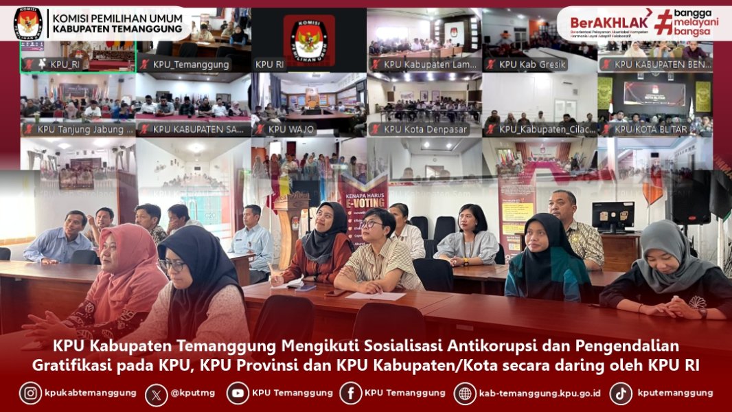 TEMANGGUNG - KPU Kabupaten Temanggung mengikuti kegiatan Sosialisasi Antikorupsi dan Pengendalian Gratifikasi pada KPU, KPU Provinsi, dan KPU Kabupaten/Kota yang diselenggarakan oleh KPU RI secara daring pada Senin, (08/09/2025)
