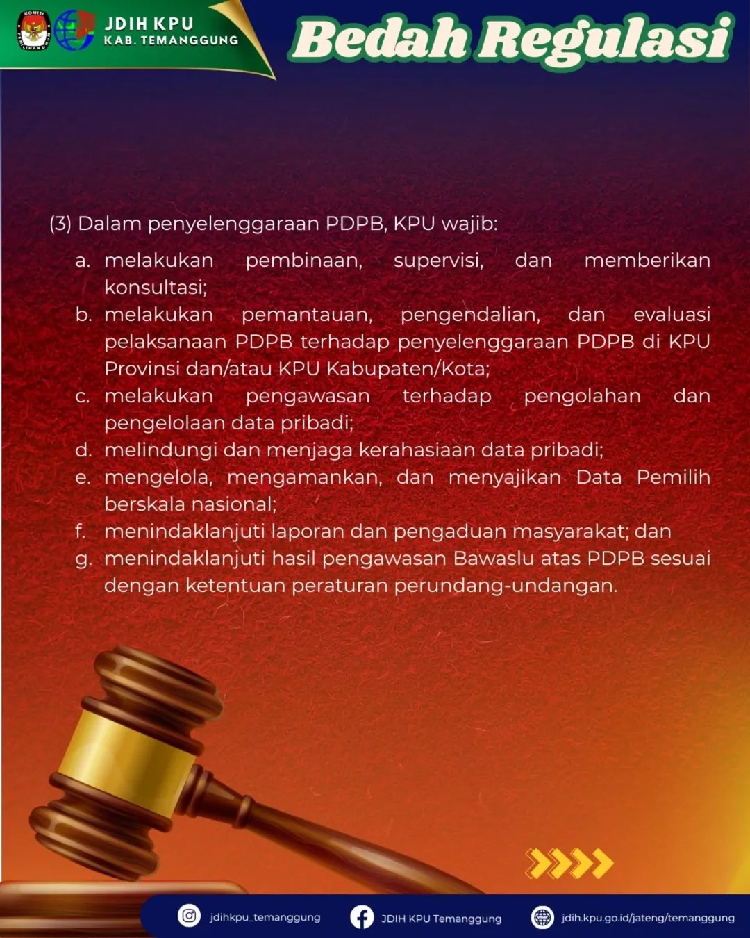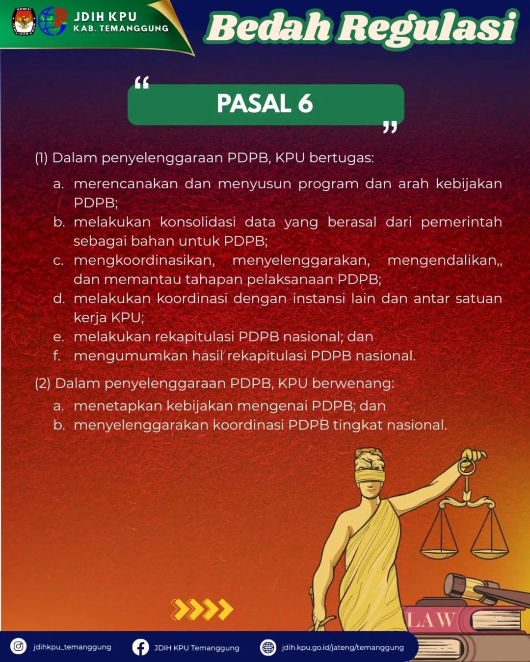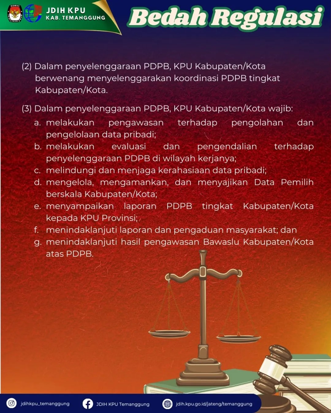 Simak informasi dari KPU Temanggung berikut mengenai Penyelenggara PDPB sesuai ketentuan regulasi yang berlaku, dan jangan lupa ikuti terus konten Bedah Regulasi KPU Kabupaten Temanggung