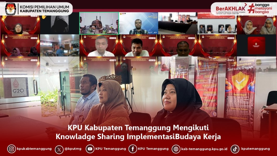 TEMANGGUNG - Dalam rangka penguatan budaya kerja ASN Ber-AKHLAK di Lingkungan Sekretariat Jendral KPU, Sekretariat KPU Provinsi dan Sekretariat KPU Kabupaten/Kota, KPU Kabupaten Temanggung mengikuti Knowledge Sharing Implementasi Budaya Kerja BerAKHLAK yang diselenggarakan oleh KPU RI secara daring pada Kamis, (25/09/2025)
