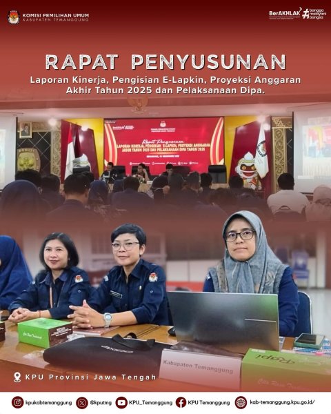 TEMANGGUNG - KPU Kabupaten Temanggung mengikuti Sharing Session kolaborasi antara “Ngopi Asli” (Ngobrol Pinter Arsip dan Logistik) dan “BerCanDa” (Bicara Seputar Perencanaan dan Data) dengan tema Perkuat Lini Tengah Administrasi: KPU Jawa Tengah Mantapkan Laporan Kinerja 2025 dan Anggaran 2025 dan Anggaran 2026 yang diselenggarakan secara luring sekaligus daring oleh KPU Provinsi Jawa Tengah, Selasa (16/12/2025)