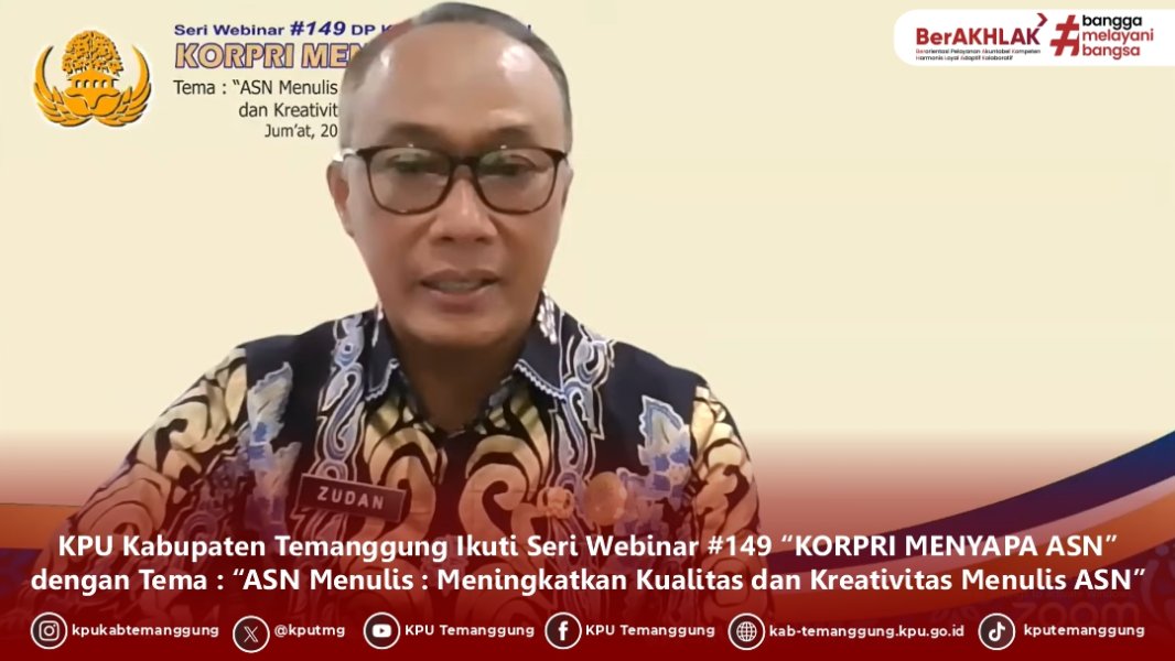 TEMANGGUNG - KPU Kabupaten Temanggung kembali ikuti Webinar KORPRI Menyapa ASN dengan tema “Meningkatkan Kualitas dan Kreativitas Menulis ASN” pada Jumat, (20/02/2026)