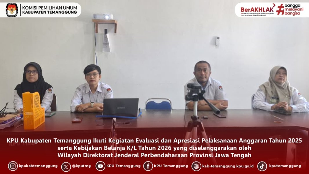 TEMANGGUNG - KPU Kabupaten Temanggung mengikuti kegiatan Evaluasi dan Apresiasi Pelaksanaan Anggaran Tahun 2025 serta Kebijakan Belanja K/L Tahun 2026 yang diselenggarakan oleh Kantor Wilayah Direktorat Jenderal Perbendaharaan Provinsi Jawa Tengah secara daring pada Kamis, (12/3/2026)
