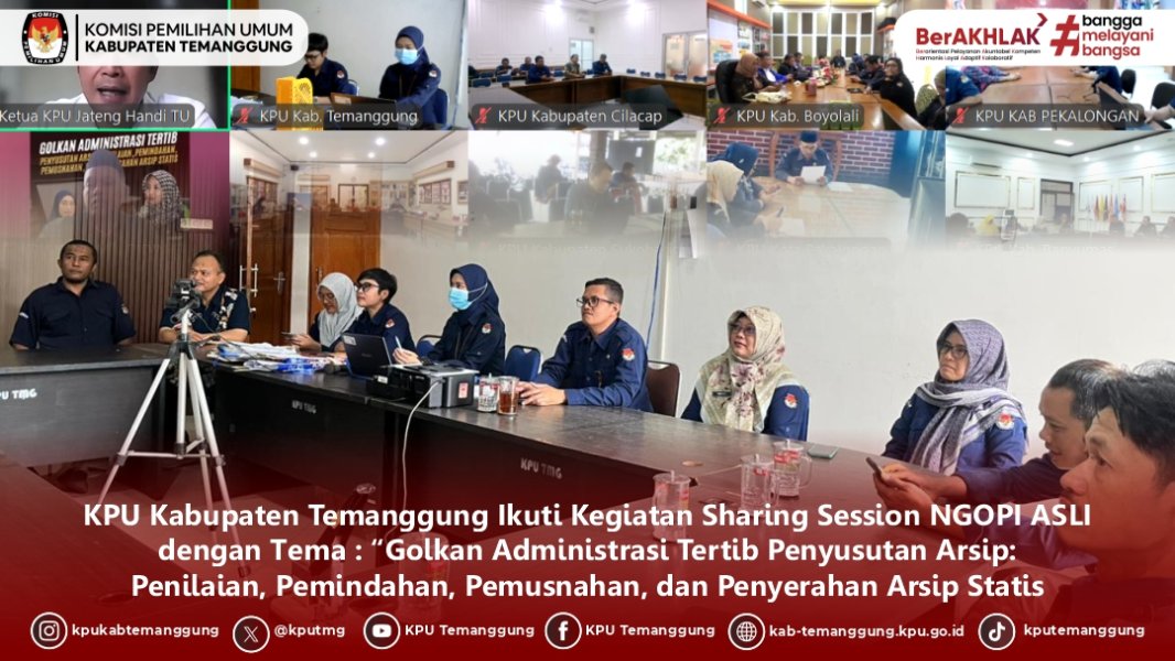 TEMANGGUNG - KPU Kabupaten Temanggung mengikuti kegiatan Sharing Session “Ngopi Asli” (Ngobrol Pinter Arsip dan Logistik) dengan tema “Golkan Administrasi Tertib Penyusutan Arsip: Penilaian, Pemindahan, Pemusnahan, dan Penyerahan Arsip Statis” secara daring pada Selasa, (31/3/2026)