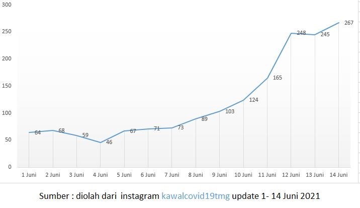 Sebagaimana data perkembangan kasus Covid 19 di Kabupaten Temanggung, dari sumber instagram kawalcovid19tmg, jumlah kasus atau penderita Covid 19 pada bulan Juni terus mengalami peningkatan setiap harinya. Pada tanggal 14 Juni misalnya, jumlah kasusnya telah meningkat hingga 471 persen dibanding jumlah pada awal bulan.