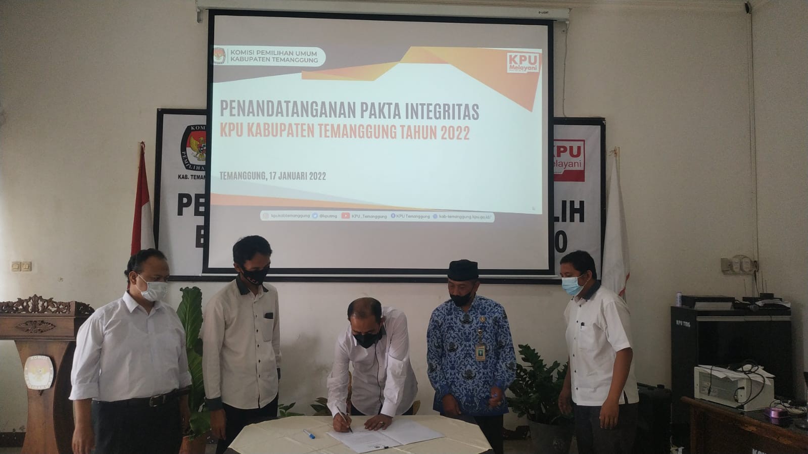 TEMANGGUNG- KPU Kabupaten Temanggung melakukan penandatanganan pakta integritas yang isi pokoknya antara lain, berkomitmen anti-KKN (korupsi, kolusi, nepotisme) dan perbuatan tercela lainnya. Penandatanganan dilakukan ketua, para anggota, sekretaris, serta para kasubag KPU Kabupaten Temanggung, di aula kantor lembaga tersebut, Senin (17/1).