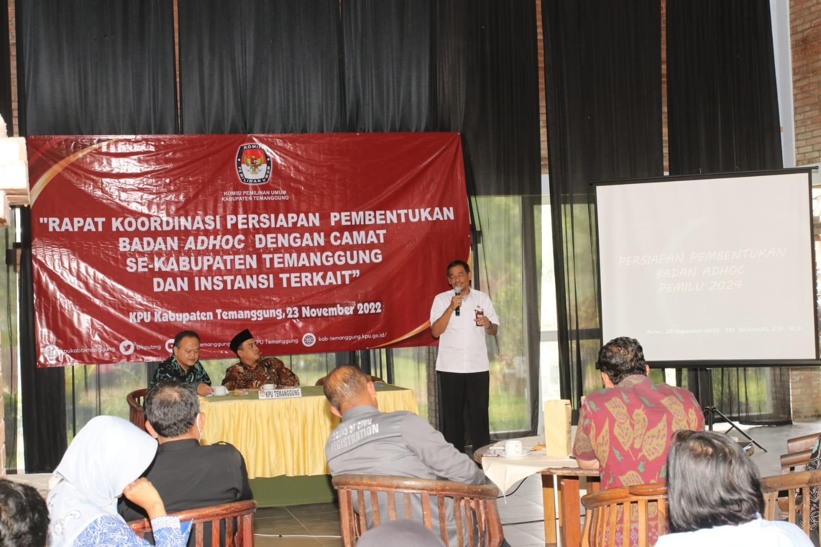 KPU Kabupaten Temanggung menggelar rapat koordinasi ini salah satu tujuannya adalah sebagai wadah koordinasi dengan pemerintah daerah Kabupaten Temanggung untuk memfasilitasi pembentukan badan adhoc ini, antara lain untuk pembentukan sekretariat Badan Adhoc, bantuan sarana dan prasarana kantor sekretariat PPK di kecamatan, serta melakukan sosialisasi pembentukan badan adhoc.