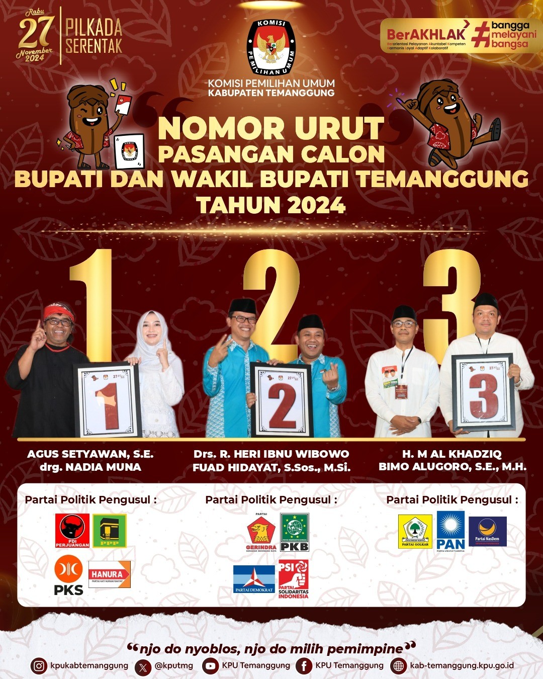 KPU Kabupaten Temanggung melalui SK 1467 Tahun 2024 menetapkan nomor urut Pasangan Calon peserta Pemilihan Bupati dan Wakil Bupati Temanggung Tahun 2024, sebagai berikut :