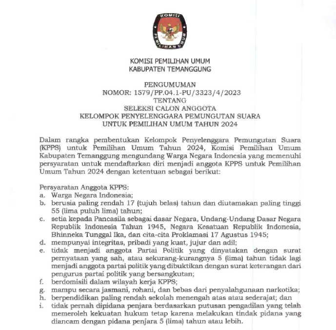 Pengumuman Pendaftaran Calon Anggota KPPS untuk Pemilu Tahun 2024 Senin, 11 Desember 2023 07:00 376 Pengumuman dan Formulir Dapat di Akses Melalui Link berikut. Bagikan: Telah dilihat 376 kali