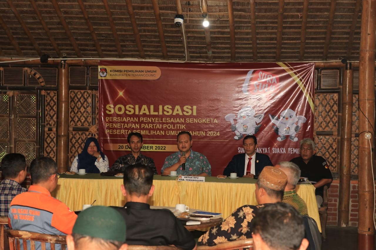Temanggung- Setelah KPU menetapkan partai politik Peserta Pemilu Tahun 2024, partai politik yang tidak ditetapkan sebagai Peserta Pemilu dapat mengajukan sengketa Pemilu. Hal ini disampaikan Anggota KPU Kabupaten Temanggung Divisi Hukum dan Pengawasan, Adib Masykuri dalam Sosialisasi Persiapan Penyelesaian Sengketa Penetapan Partai Politik Peserta Pemilu 2024, Selasa (20/12), di Kampung Sawah.