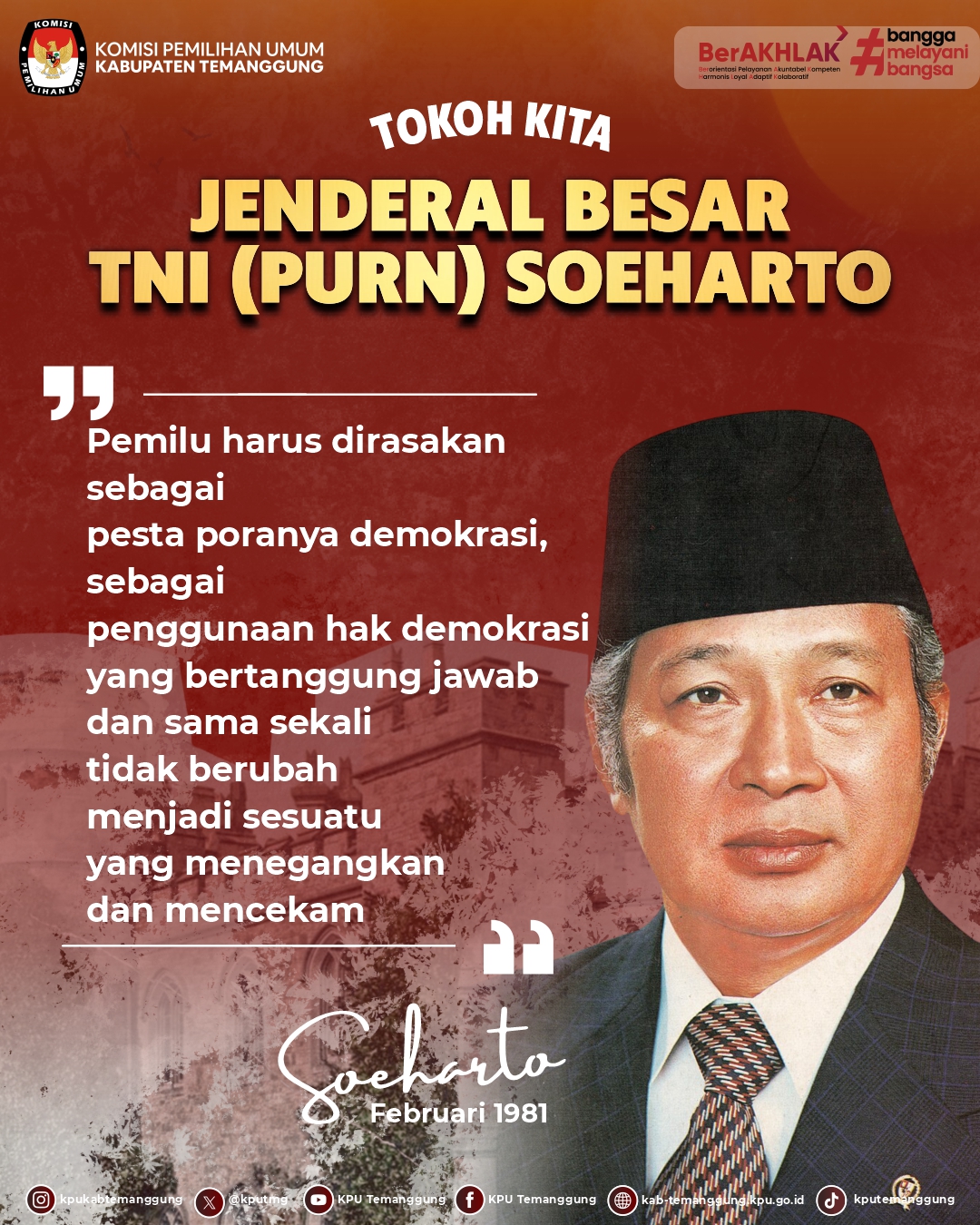 Hai #TemanPemilih, hari ini KPU Kab. Temanggung mengajak teman semua untuk mengenal lebih jauh sosok Tokoh Kita berikutnya, Jenderal Besar TNI (Purn) Soeharto