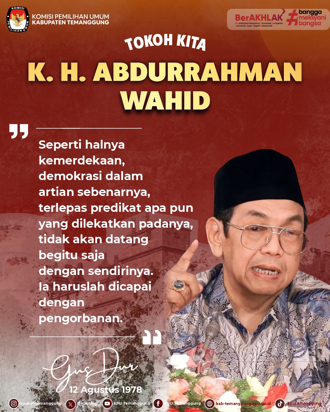 Hai #TemanPemilih, hari ini KPU Kab. Temanggung mengajak teman semua untuk mengenal lebih jauh sosok salah satu tokoh Bangsa Indonesia, Presiden Abdurrahman Wahid