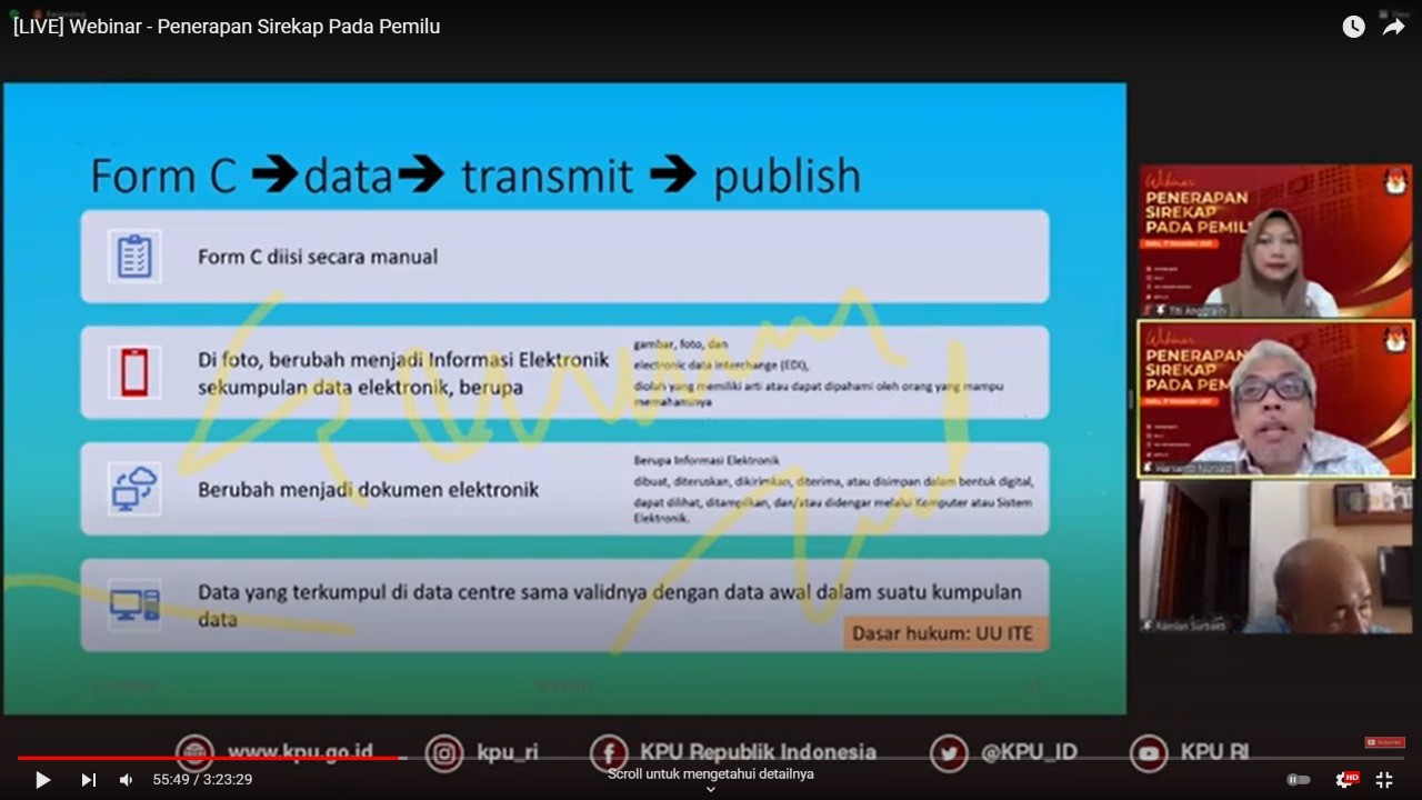 Harsanto Nursadi, dosen Hukum Administrasi Negara Universitas Indonesia (UI), dalam Webinar “Penerapan Sirekap Pada Pemilu 2024” yang diadakan KPU RI, Rabu (17/11) mengatakan, secara hukum Informasi dan Transaksi Elektronik (ITE), hasil serta proses penggunaan Sirekap adalah sah