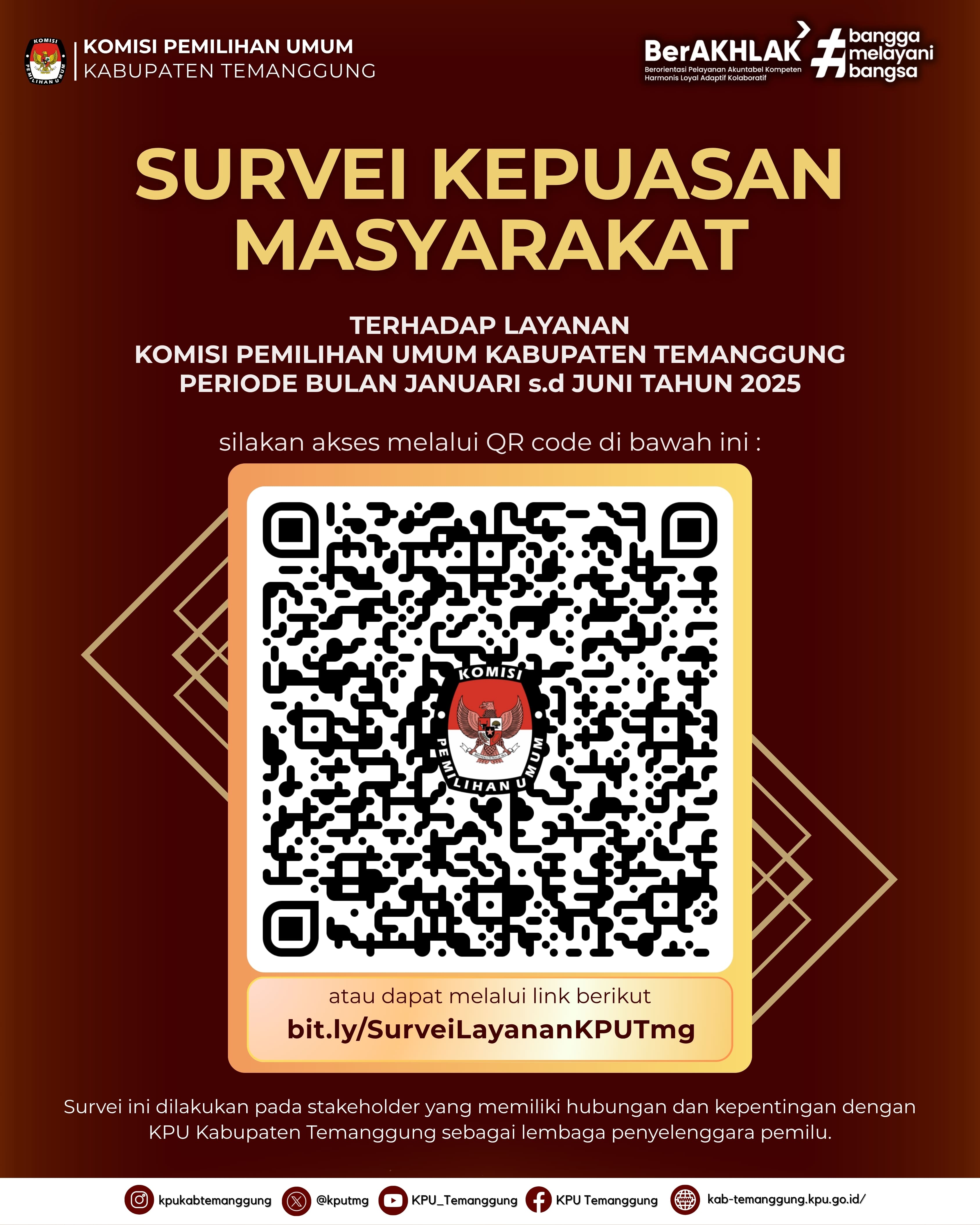 #TemanPemilih, KPU Kabupaten Temanggung melaksanakan Survei Layanan untuk Periode bulan Januari sampai dengan Juni 2025. Bagi #TemanPemilih yang pernah mendapatkan layanan dari KPU Kabupaten Temanggung di periode tersebut, silakan berpartisipasi ya!