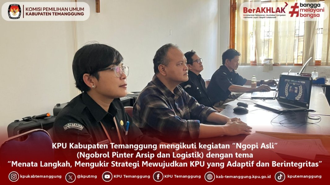 TEMANGGUNG - KPU Kabupaten Temanggung mengikuti kegiatan “Ngopi Asli” (Ngobrol Pinter Arsip dan Logistik) dengan tema “Menata Langkah, Mengukir Strategi Mewujudkan KPU yang Adaptif dan Berintegritas”. Kegiatan ini menjadi wadah diskusi dan koordinasi strategis antar jajaran KPU se-Jawa Tengah dalam rangka menyelaraskan arah kebijakan kelembagaan dengan Rencana Strategis (Renstra) KPU RI periode 2025–2029. Kegiatan ini dilaksanakan oleh KPU Provinsi Jawa Tengah.