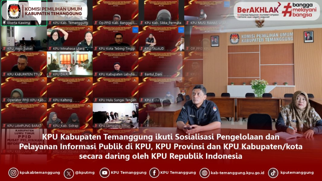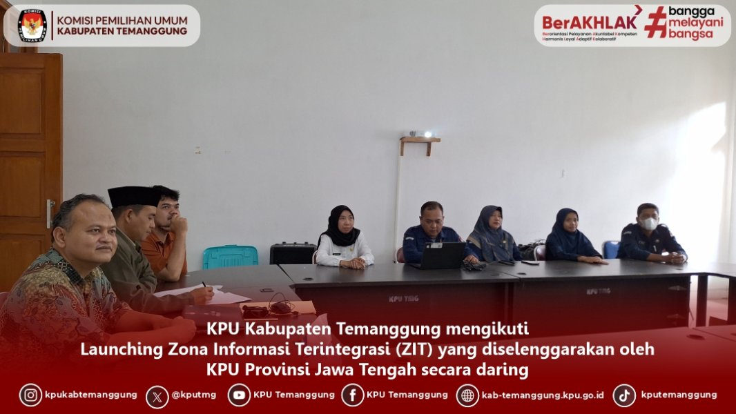 TEMANGGUNG - KPU Kabupaten Temanggung mengikuti Launching Zona Informasi Terintegrasi (ZIT) yang diselenggarakan oleh KPU Provinsi Jawa Tengah secara daring pada Selasa, (1/7/2025) ZIT merupakan layanan informasi terintegrasi yang meliputi Pejabat Pengelola Informasi dan Dokumentasi (PPID), Jaringan Dokumentasi dan Informasi Hukum (JDIH), dan Badan Koordinasi Kehumasan (Bakohumas). ZIT juga dapat difungsikan sebagai Ruangan Telekonferensi dan Ruangan Konsultasi bagi warga yang membutuhkan informasi Kepemiluan di KPU Provinsi Jawa Tengah Anggota KPU RI Iffa Rosita yang berkesempatan hadir secara daring, mengapresiasi inovasi yang diinisiasi oleh KPU Provinsi Jawa Tengah dalam meningkatkan kualitas layanan informasi publik. Iffa berpesan agar slogan yang dibangun oleh KPU Provinsi Jawa Tengah, yakni “Pimpinan sebagai role model mewujudkan zona integritas” bukan hanya menjadi slogan semata, tapi diwujudkan dengan kerja-kerja nyata #Temanggung #kputemanggung #kpumelayani #ZIT #KPUjateng