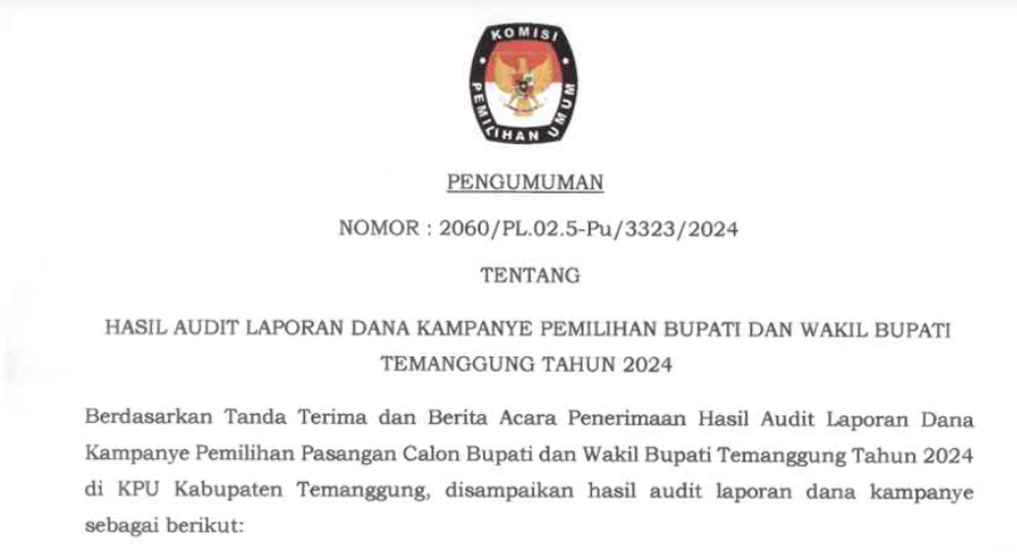 Pengumuman Hasil Audit Laporan Dana Kampanye Pemilihan Bupati dan Wakil Bupati Temanggung Tahun 2024