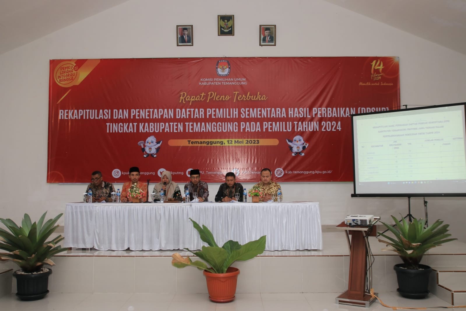 Temanggung- KPU Kabupaten Temanggung menggelar Rapat Pleno Terbuka Rekapitulasi dan Penetapan Daftar Pemilih Sementara Hasil Perbaikan Pemilu 2024 di tingkat Komisi Pemilihan Umum Kabupaten Temanggung, Jumat (12/5), bertempat di Gedung Babussalam, Temanggung. Dalam rapat pleno terbuka tersebut, KPU Kabupaten Temanggung menetapkan Daftar Pemilih Sementara (DPS) di Kabupaten Temanggung sejumlah 617.030 pemilih yang tersebar di 20 kecamatan dan 289 desa/kelurahan. “KPU Kabupaten Temanggung menetapkan Rekapitulasi Hasil Perbaikan Daftar Pemilih Sementara Kabupaten Temanggung dengan jumlah TPS sebanyak 2.518, jumlah pemilih laki-laki 308.365 pemilih, dan jumlah pemilih perempuan 308.665, dan jumlah total sebanyak 617.030 pemilih,” papar Ketua KPU Kabupaten Temanggung, Mukhamad Yusuf Hasyim saat membacakan Berita Acara Nomor 198/PK.01-BA/3323/2023 tentang Rekapitulasi Hasil Perbaikan Daftar Pemilih Sementara (DPS) Tingkat Kabupaten Temanggung Pemilihan Umum Tahun 2024. Dalam rapat pleno tersebut, juga dibacakan Rekapitulasi Hasil Perbaikan Daftar Pemilih Sementara (DPS) di setiap kecamatan oleh Anggota KPU Kabupaten Temanggung Divisi Perencanaan, Data dan Informasi, Masithoh Dian Setyatuhu. Rapat Pleno Terbuka dipimpin Ketua KPU Kabupaten Temanggung serta dihadiri seluruh Anggota KPU Kabupaten Temanggung, Bawaslu Kabupaten Temanggung dan dihadiri dinas/instansi terkait di wilayah Kabupaten Temanggung, perwakilan Partai Politik Peserta Pemilu Tahun 2024 di Tingkat Kabupaten Temanggung serta Ketua dan Anggota PPK Divisi Perencanaan, Data dan Informasi se-Kabupaten Temanggung. []