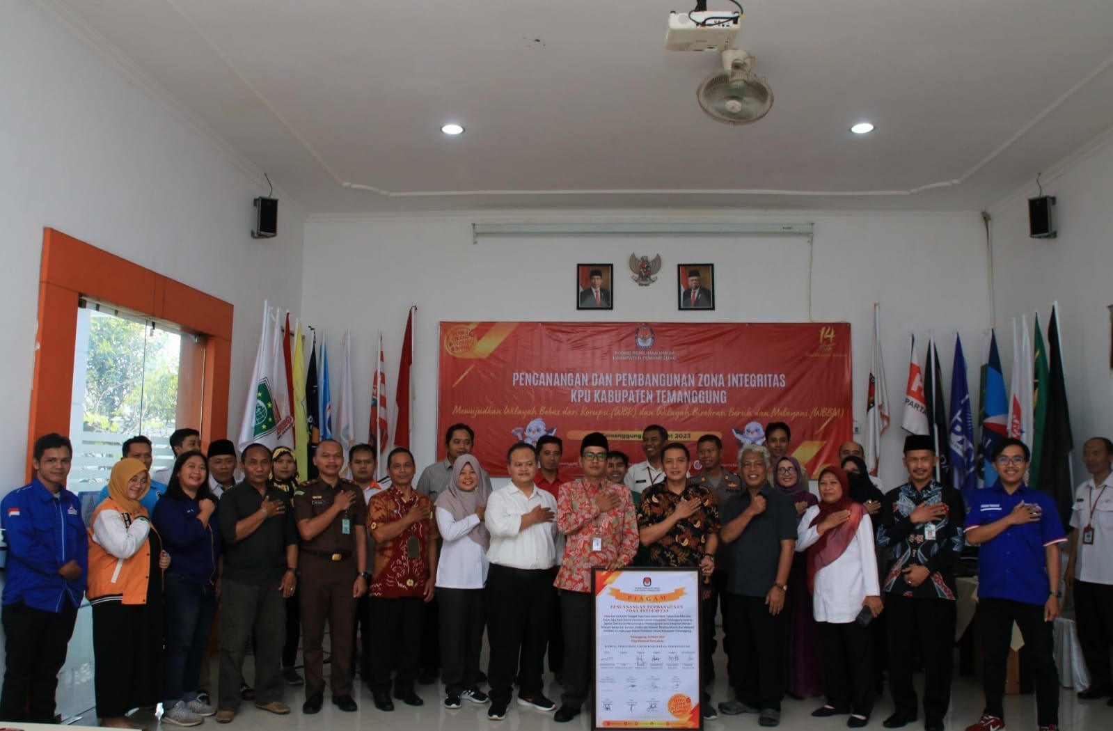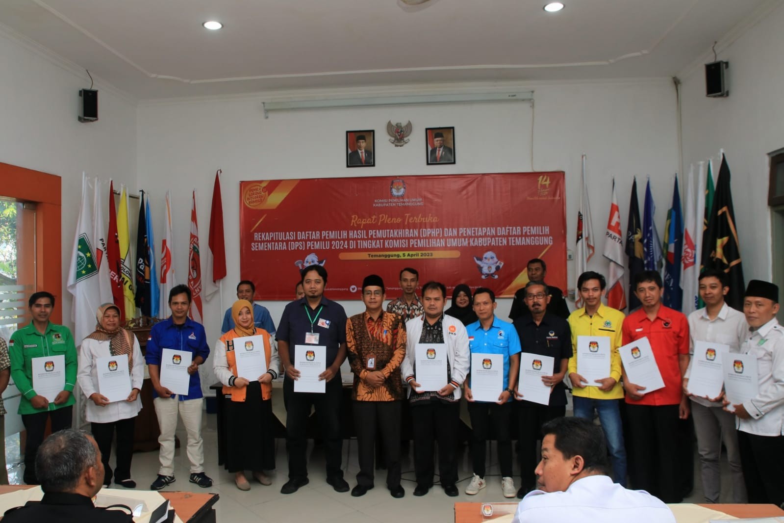 Temanggung- KPU Kabupaten Temanggung menggelar Rapat Pleno Terbuka Rekapitulasi Daftar Pemilih Hasil Pemutakhiran (DPHP) dan Penetapan Daftar Pemilih Sementara Pemilu 2024 di tingkat Komisi Pemilihan Umum Kabupaten Temanggung. Dalam rapat pleno terbuka tersebut, KPU Kabupaten Temanggung menetapkan Daftar Pemilih Sementara (DPS) di Kabupaten Temanggung sejumlah 617.814 pemilih yang tersebar di 20 kecamatan dan 289 desa/kelurahan. “KPU Kabupaten Temanggung menetapkan Rekapitulasi Daftar Pemilih Sementara Kabupaten Temanggung dengan jumlah TPS sebanyak 2.518, jumlah pemilih laki-laki 308.820 pemilih, dan jumlah pemilih perempuan 308.994, dan jumlah total sebanyak 617.814 pemilih,” papar Ketua KPU Kabupaten Temanggung, Mukhamad Yusuf Hasyim saat membacakan Berita Acara Nomor 159/PL.01/3323/2023 tentang Rekapitulasi Daftar Pemilih Sementara (DPS) Tingkat Kabupaten Temanggung Pemilihan Umum Tahun 2024. Yusuf juga menyampaikan KPU Kabupaten Temanggung telah menerima masukan dari Rumah Tahanan Negara Kelas II B Temanggung. Masukan tersebut menjadi dasar bagi KPU Kabupaten Temanggung untuk menetapkan Pemilih di TPS Lokasi Khusus. Dalam rapat pleno tersebut, juga dibacakan Rekapitulasi Daftar Pemilih Sementara (DPS) di setiap kecamatan oleh Anggota KPU Kabupaten Temanggung Divisi Perencanaan, Data dan Informasi, Masithoh Dian Setyatuhu. Rapat Pleno Terbuka dipimpin Ketua KPU Kabupaten Temanggung serta dihadiri seluruh Anggota KPU Kabupaten Temanggung, Bawaslu Kabupaten Temanggung dan dihadiri dinas/instansi terkait di wilayah Kabupaten Temanggung serta perwakilan Partai Politik Peserta Pemilu Tahun 2024 di Tingkat Kabupaten Temanggung. []