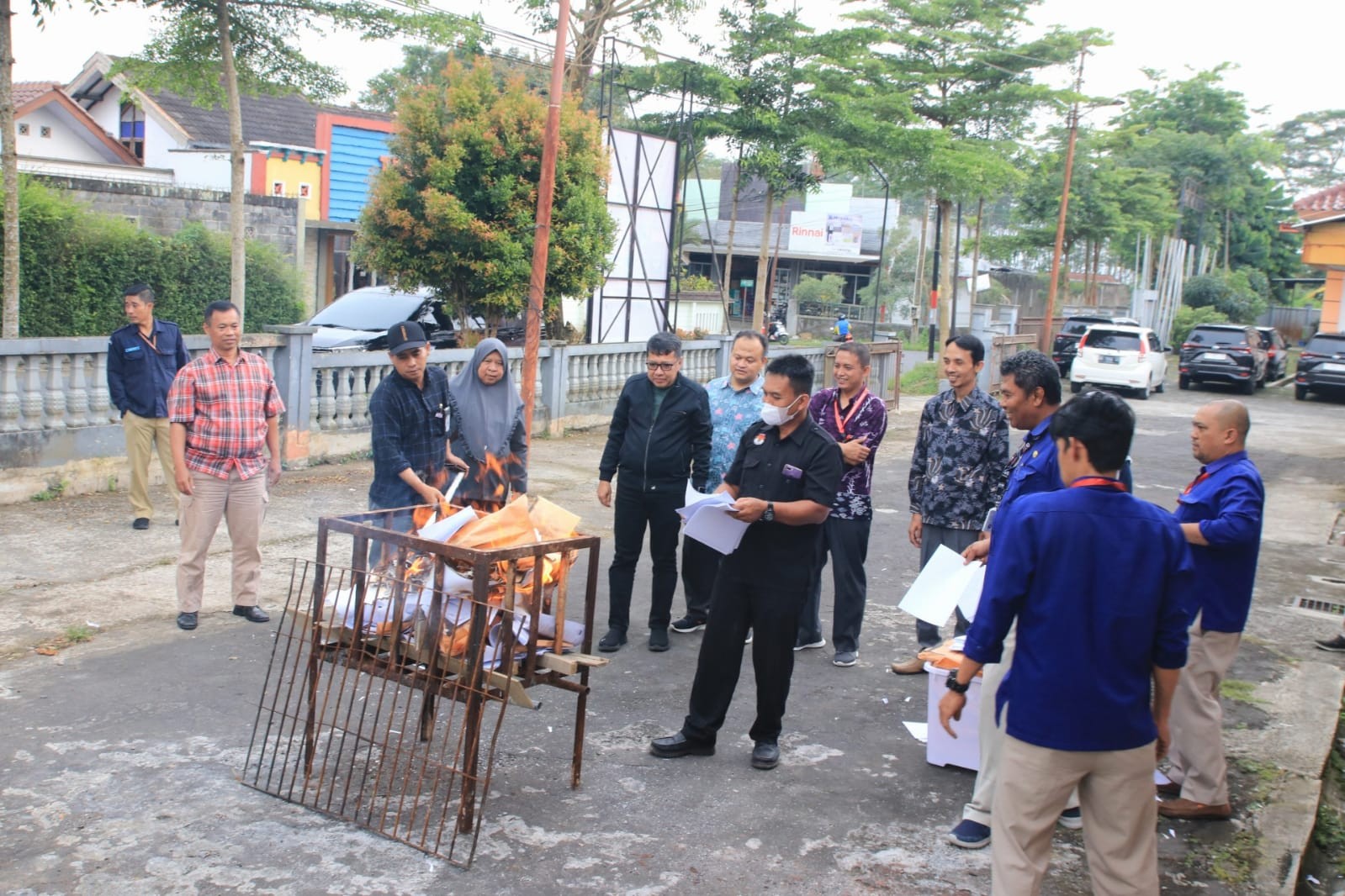 Temanggung- Pasca pelaksanaan seleksi tertulis Panitia Pemungutan Suara (PPS) Pemilu Tahun 2024 di Kabupaten Temanggung, sebanyak 25.200 lembar soal seleksi tertulis dimusnahkan KPU Temanggung, Selasa (10/1), bertempat di depan kantor KPU setempat. “Setelah kemarin (9/1) selesai menyelenggarakan seleksi tertulis di 20 kecamatan, maka pada hari ini KPU Kabupaten Temanggung melakukan pemusnahan seluruh lembar soal yang digunakan maupun yang tidak digunakan,” ungkap Mukhamad Yusuf Hasyim, Ketua KPU Kabupaten Temanggung. KPU Kabupaten Temanggung menggandakan 25.200 lembar soal untuk seleksi tertulis PPS dengan metode konvensional. Dari jumlah tersebut, pada pelaksanaan seleksi, sebanyak 24.300 lembar soal dibagikan kepada peserta dan sebanyak 900 lembar soal yang tidak digunakan karena terdapat peserta yang tidak hadir dan merupakan lembar soal cadangan. Anggota KPU Divisi Sosialisasi, Partisipasi Masyarakat, Pendidikan Pemilih dan SDM, Henry Sofyan Rois menyampaikan, pemusnahan tersebut bertujuan agar tidak ada pihak-pihak yang memanfaatkan lembar soal tersebut. “Mengingat jadwal pelaksanaan seleksi tertulis itu mulai dari tanggal 9 s.d. 11 Januari 2022, maka hari ini masih terdapat daerah-daerah yang menyelenggarakan seleksi tertulis. Oleh karena itu, pemusnahan lembar soal ini ditujukan agar tidak dimanfaatkan oleh pihak-pihak lain yang kurang bertanggung jawab,” tegas Henry. Dalam pemusnahan lembar soal seleksi tertulis PPS ini juga dihadiri Ketua Bawaslu Kabupaten Temanggung, Erwin Nurachmani Prabawanti dan dilakukan penandatanganan Berita Acara Pemusnahan Lembar Soal. []