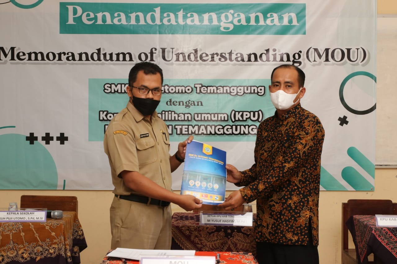 TEMANGGUNG- Setelah sukses melaksanakan pendidikan pemilih dalam kegiatan Pilketos (pemilihan ketua OSIS) secara elektronik atau e-voting yang difasilitasinya di sejumlah sekolahan, KPU Kabupaten Temanggung kini mulai melaksanakan pendidikan pemilih kepada para siswa di sekolahan yang menggelar Pilketos secara online atau daring. Sekolah yang menggelar Pilketos secara online dan mendapatkan pendidikan pemilih dari KPU Temanggung itu ialah SMK Dr Soetomo Temanggung. Hal tersebut menyusul telah ditandatanganinya naskah Memorandum of Understanding (MoU) atau saling kesepahaman antara SMK Dr Soetomo dan KPU Temanggung, di SMK setempat, Senin (7/3). "Kita menghadirkan KPU di sini dan melakukan penandatanganan MoU ini, untuk ikut serta mendidik anak didik kita yang akan menginjak usia 17 tahun, yang akan menjadi pemilih pemula nanti di Pemilu agar mereka dapat memilih secara rasional,"ujar Kasek SMK Dr Soetomo, Teguh Puji Utomo, usai menandatangani MoU tersebut. Menurut Teguh, pihaknya menyadari pentingnya pendidikan demokrasi bagi para siswa agar dapat menggunakan hak suaranya dengan baik dan bijak. Termasuk, dimulai dari Pilketos di sekolahannya yang akan digelar secara online lewat google form tersebut. Adapun salah satu kesepakatan dalam MoU yang dibacakan saat penandatanganan itu adalah, SMK Dr Soetomo akan memfasilitasi kegiatan pendidikan pemilih oleh KPU Temanggung kepada para siswanya. Sementara dalam rangka Pilketos, KPU Temanggung akan memberikan pendidikan pemilih kepada para siswa secara daring. Teknisnya, KPU Temanggung akan menyampaikan video youtube materi pendidikan pemilih kepada sekolah. Lalu pihak sekolah membagikannya kepada setiap siswanya untuk disaksikan dan dicermati sebelum mereka menggunakan hak pilihnya dalam Pilketos. Siswa juga diminta menjawab beberapa pertanyaan terkait materi pendidikan pemilih tersebut melalui google form. Ketua KPU Kabupaten Temanggung, M Yusuf Hasyim, dalam sambutannya pada penandatanganan MoU itu mengatakan, memberikan pembelajaran nilai-nilai demokrasi pada para siswa penting, karena mereka adalah harapan bangsa dan menjadi tonggak demokrasi. Karena itu, menjalin kerjasama dengan lembaga pendidikan bagi KPU adalah keniscayaan "Tidak mungkin hanya penyelenggara saja yang berintegritas, peserta pemilu serta para pemilih juga harus berintegritas untuk dapat mewujudkan demokrasi berintegritas. Dengan demikian, menjadi kewajiban kita bersama menanamkan nilai-nilai demokrasi kepada anak-anak,"paparnya. (Ania,HS)