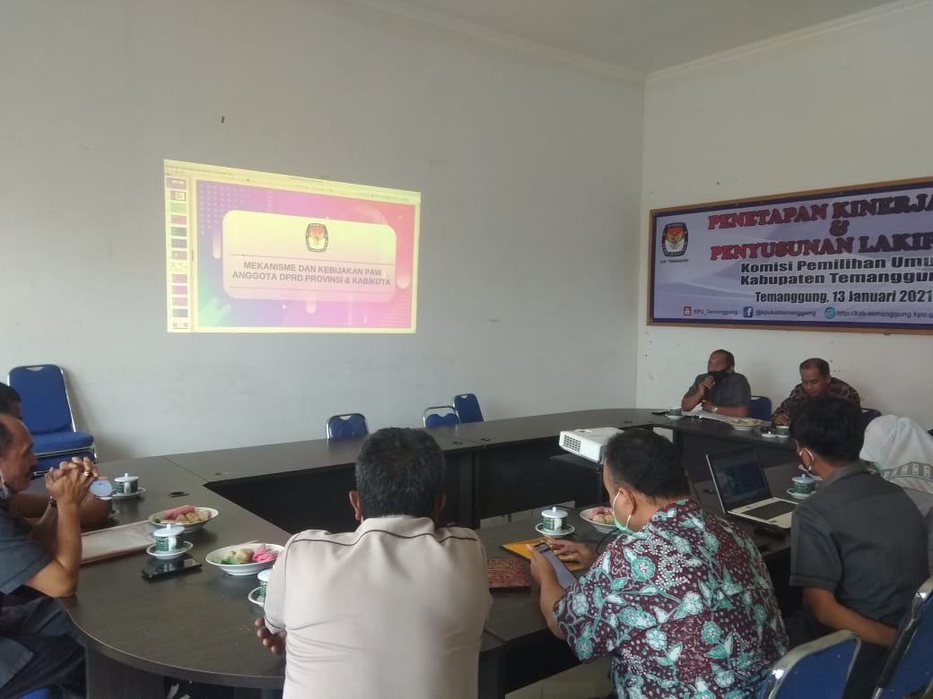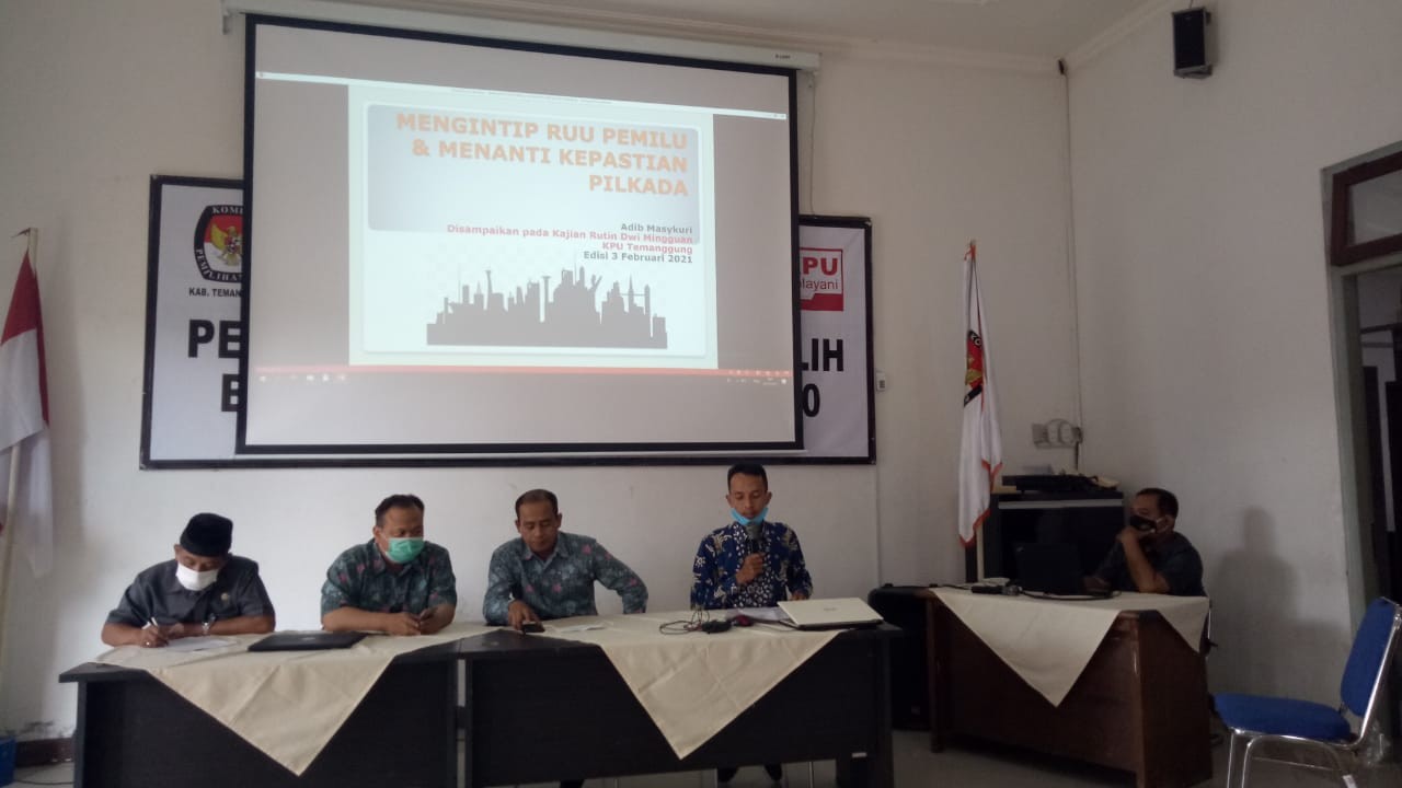 Temanggung, Pada putaran kedua Bedah Regulasi Kepemiluan Komisi Pemilihan Umum Kab Temanggung bersama-sama membedah Naskah Rancangan Undang-undang (RUU) Pemilihan Umum draft bulan Nopember 2020 yang saat ini sedang digodok oleh Komisi II DPR RI. Komisioner Divisi Hukum dan Pengawasan Adib Masykuri saat memberikan materi menuturkan bahwa saat ini regulasi terkait kepemiluan ada beberapa yaitu 1). UU 2/2008 jo. UU 2/2011 tentang Parpol. 2). UU 17/2014 jo. UU 2/2018, UU 13/2019 tentang MD3. 3). UU 1/2015 jo. UU 8/2015 jo. UU 10/2016, UU 6/2020 tentang Pilkada. 4). UU 7/2017 tentang Pemilu. 5). UU 23/2004 jo UU 9/2015 terkait Pemda 6). Putusan atas pengujian UU Bidang Politik. “Terkait dengan pelaksanaan Pilkada saat ini masih mengacu pada UU 10/2016 dimana Kab Temanggung pelaksanaan Pilkada adalah bulan Nopember tahun 2024, namun kita sebagai penyelenggara menunggu kepastian hal tersebut setelah RUU Pemilu disahkan. Pada dasarnya KPU Kab Temanggung hanya melaksanakan amanat UU,” tambahnya. Kegiatan bedah regulasi kepemiluan ini adalah program rutin KPU Kab Temanggung dwi mingguan dengan mengambil topik yang berbeda-beda. Acara putaran kali ini berlangsung pada Rabu, 3 Februari 2021 bertempat di Aula KPU Kab Temanggung diikuti oleh komisioner dan staff sekretariat. (AM)