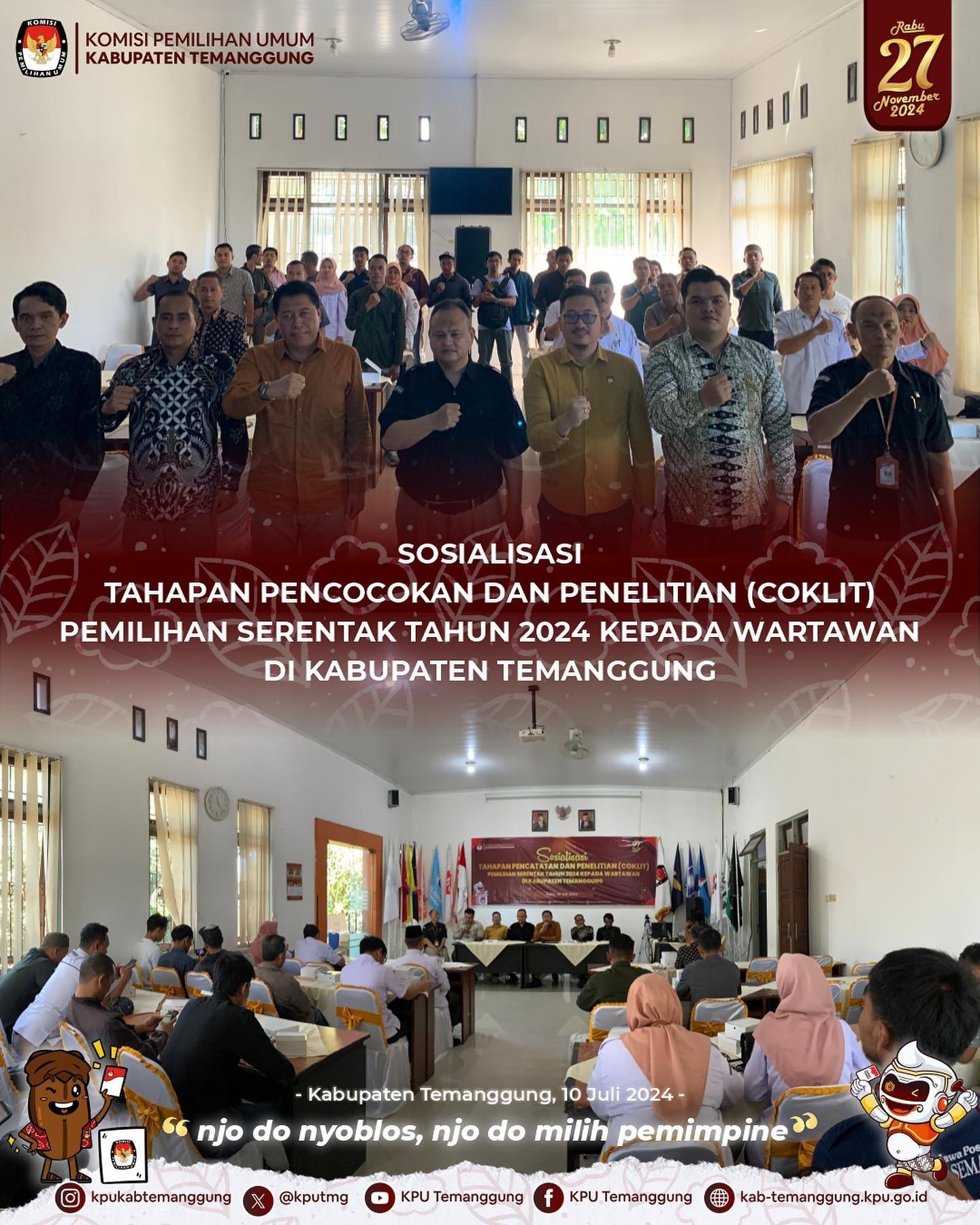 Komisi Pemilihan Umum Temanggung menggelar sosialisasi tahapan Pencocokan dan Penelitian (Coklit) pada para awak media yang ada di Kabupaten Temanggung. Rabu, 10 Juli 2024