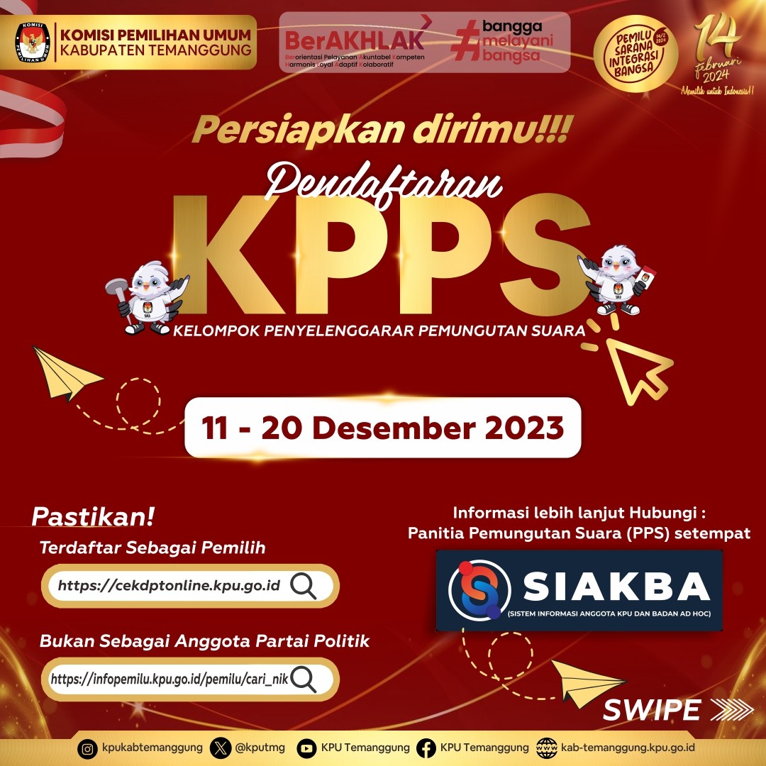 PPS Kelurahan/Desa pada Kabupaten Temanggung telah melaksanakan tahapan Pendaftaran Calon Kelompok Penyelenggara Pemungutan Suara untuk Pemilu Tahun 2024 pada tanggal 11 Desember 2023 sampai dengan 20 Desember 2023.