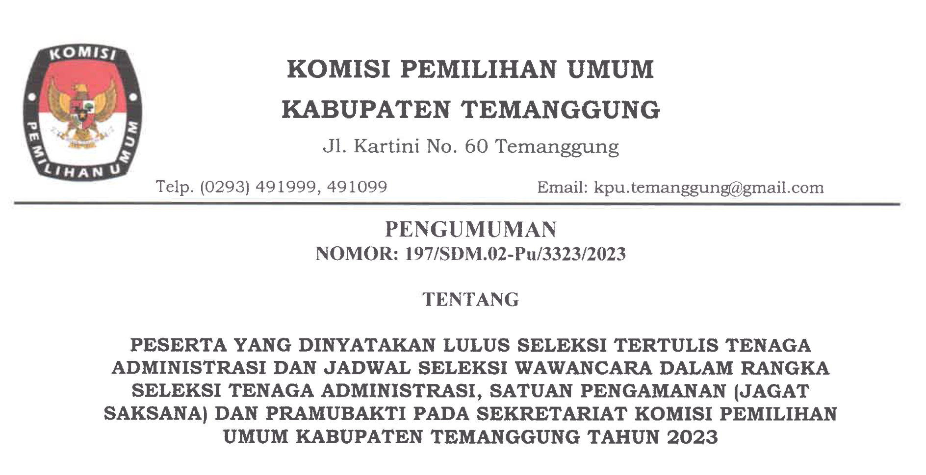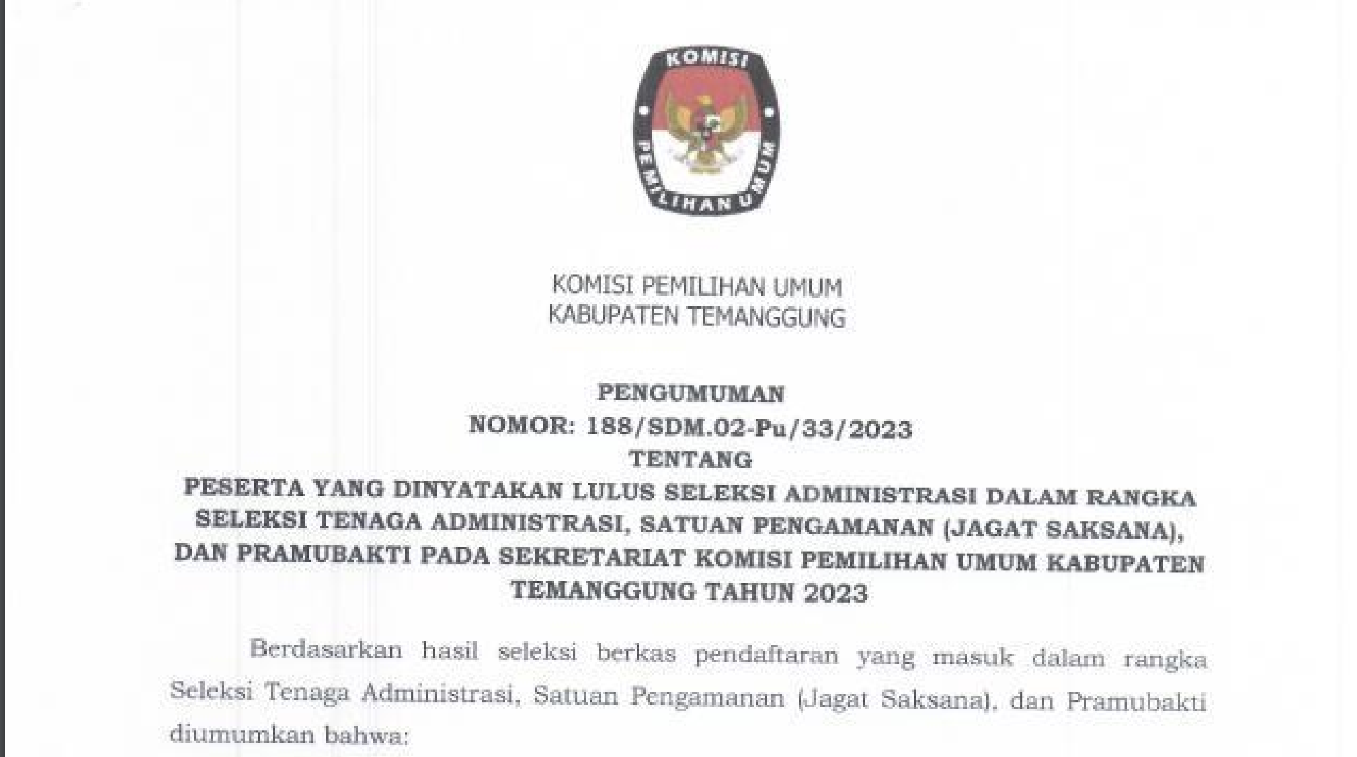 Berdasarkan Berita Acara Rapat Pleno KPU Kabupaten Temanggung Nomor 25/PK.01-BA/3323/2023 tanggal 22 Januari 2023 tentang Hasil Seleksi Calon Anggota Panitia Pemungutan Suara Untuk Pemilihan Umum Tahun 2024, bersama ini disampaikan Pengumuman KPU Kabupaten Temanggung Nomor 86/PP.04.1-Pu/3323/2023 tentang Penetapan Hasil Seleksi Panitia Pemungutan Suara untuk Pemilu Tahun 2024